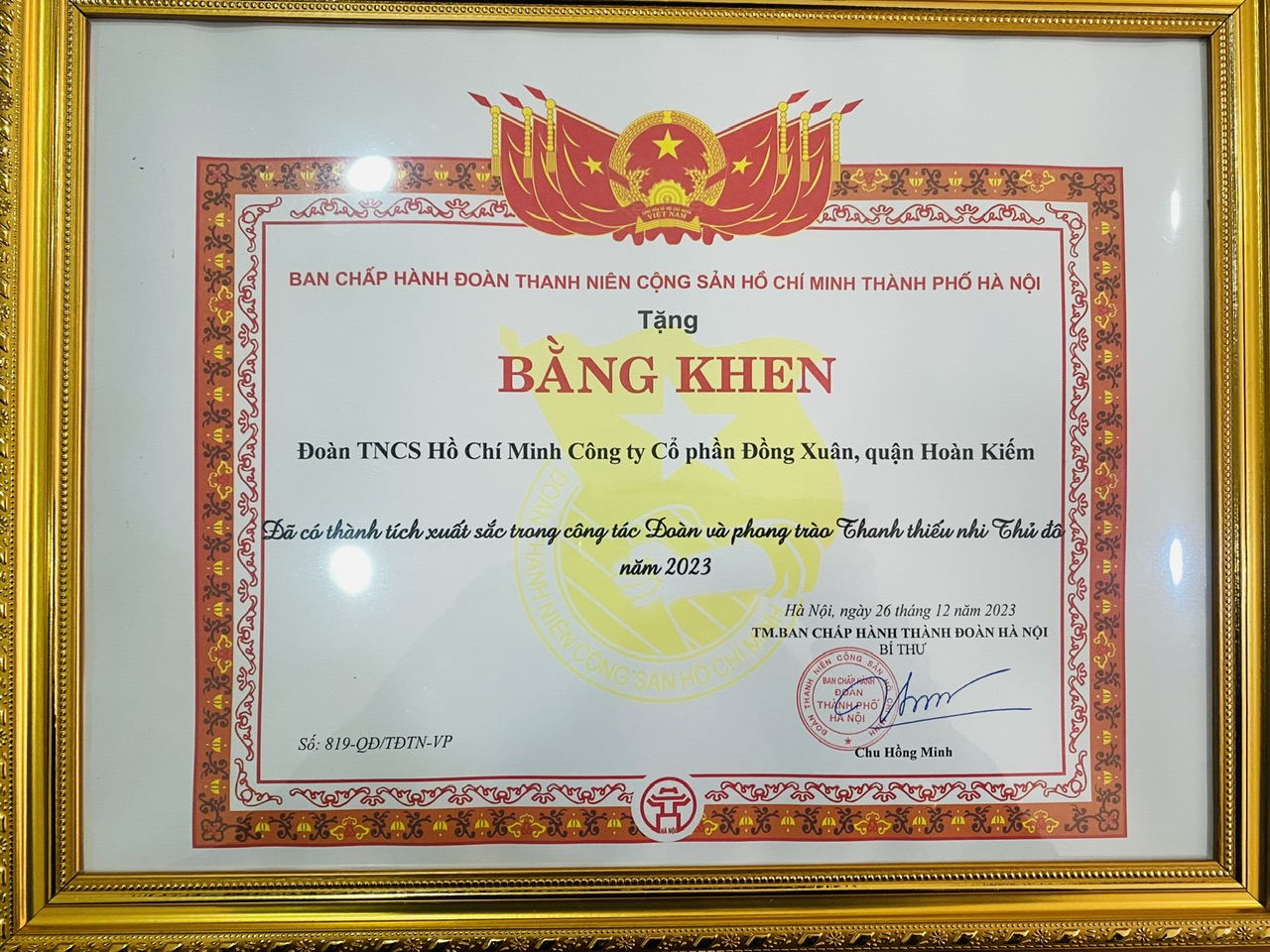 Với những kết quả đã đạt được, Đoàn thanh niên Công ty Cổ phần Đồng Xuân vinh dự được nhận Bằng khen của Thành Đoàn Hà Nội và Giấy khen của Tổng Giám đốc Công ty Cổ phần Đồng Xuân.