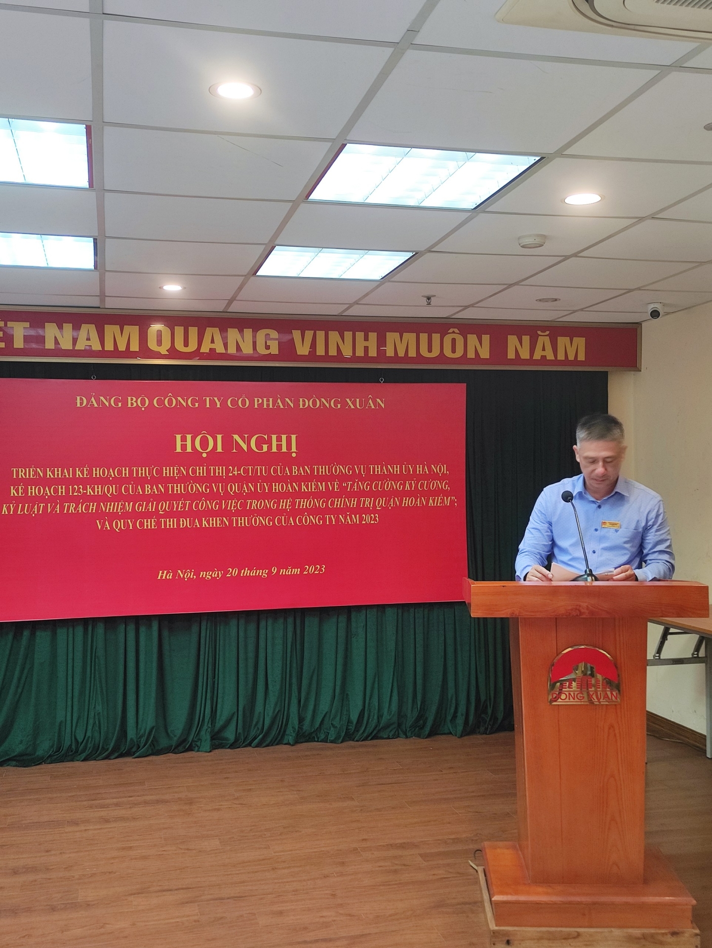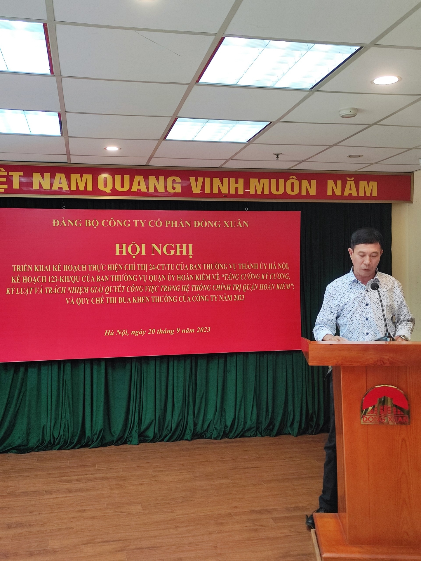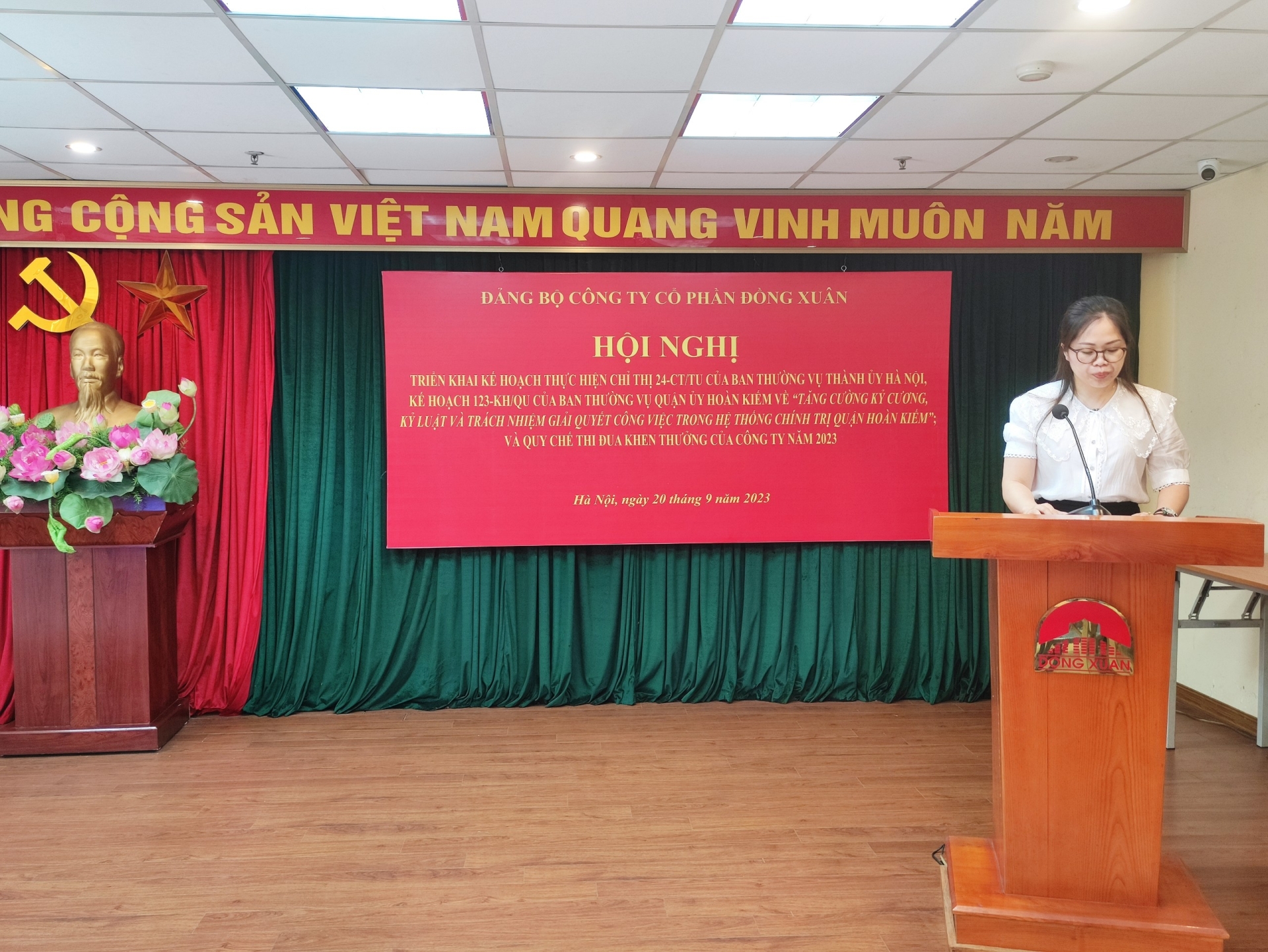 Hội nghị đã được nghe Đ/c Vũ Thành Kiên - Phó Tổng Giám đốc triển khai Kế hoạch tăng cường kỷ cương, kỷ luật và trách nhiệm giải quyết công việc trong Đảng bộ Công ty Cổ phần Đồng Xuân. Kế hoạch gồm các nhiệm vụ chính: (1) Tuyên truyền, quán triệt và triển khai thực hiện kế hoạch; (2) Đổi mới mạnh mẽ phương thức lãnh đạo, chỉ đạo, quản lý điều hành của các cấp uỷ đảng, Hội đồng quản trị, Ban Điều hành Công ty và các đoàn thể trực thuộc; (3) Rà soát, bổ sung, sửa đổi quy chế làm việc; các quy trình điều hành chung, quy trình giải quyết công việc nội bộ; (4) Siết chặt kỷ cương, kỷ luật, đạo đức công vụ của cán bộ, nhân viên công ty; kịp thời xử lý các trường hợp vi phạm; (5) Nâng cao chất lượng các cuộc họp và ban hành văn bản của Công ty, chỉ đạo theo hướng rõ trách nhiệm, rõ thẩm quyền, rõ nguyên tắc; (6) Công tác kiểm tra, giám sát, kiểm soát chặt chẽ việc thực hiện nhiệm vụ Thành phố, Quận ủy- UBND quận và Đảng ủy Công ty giao.