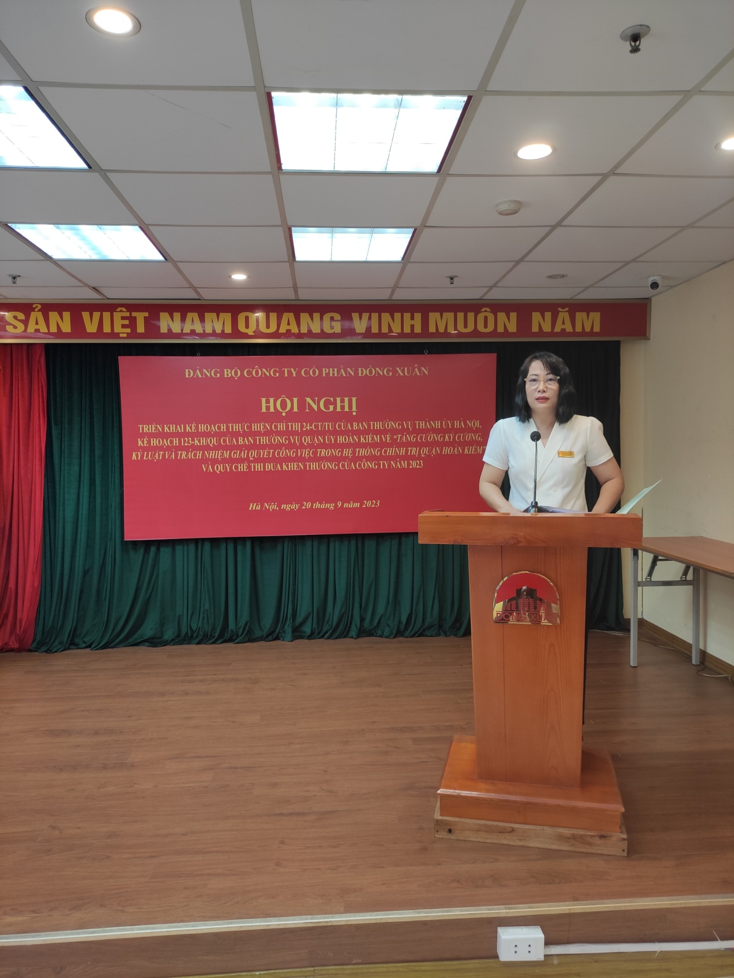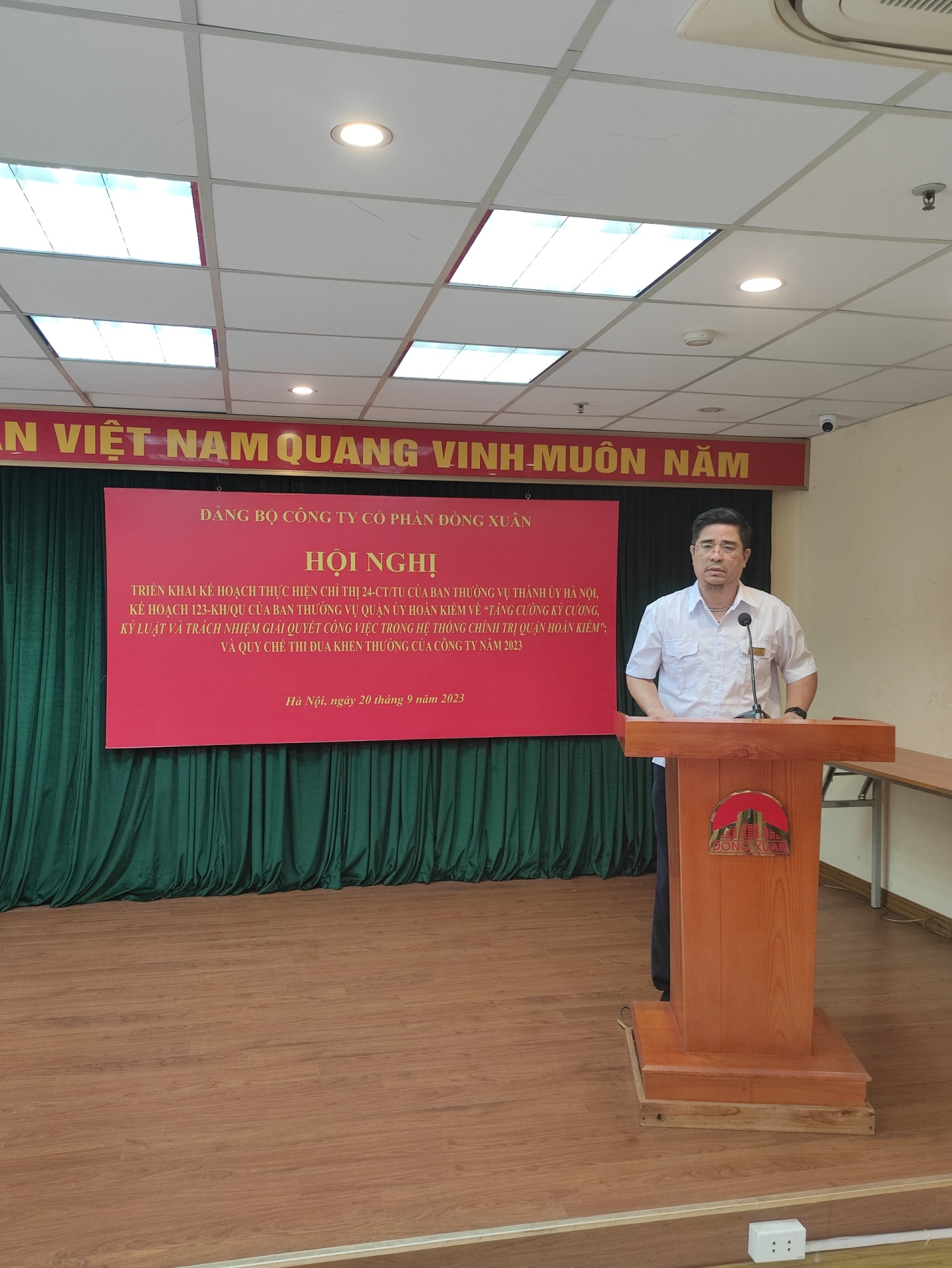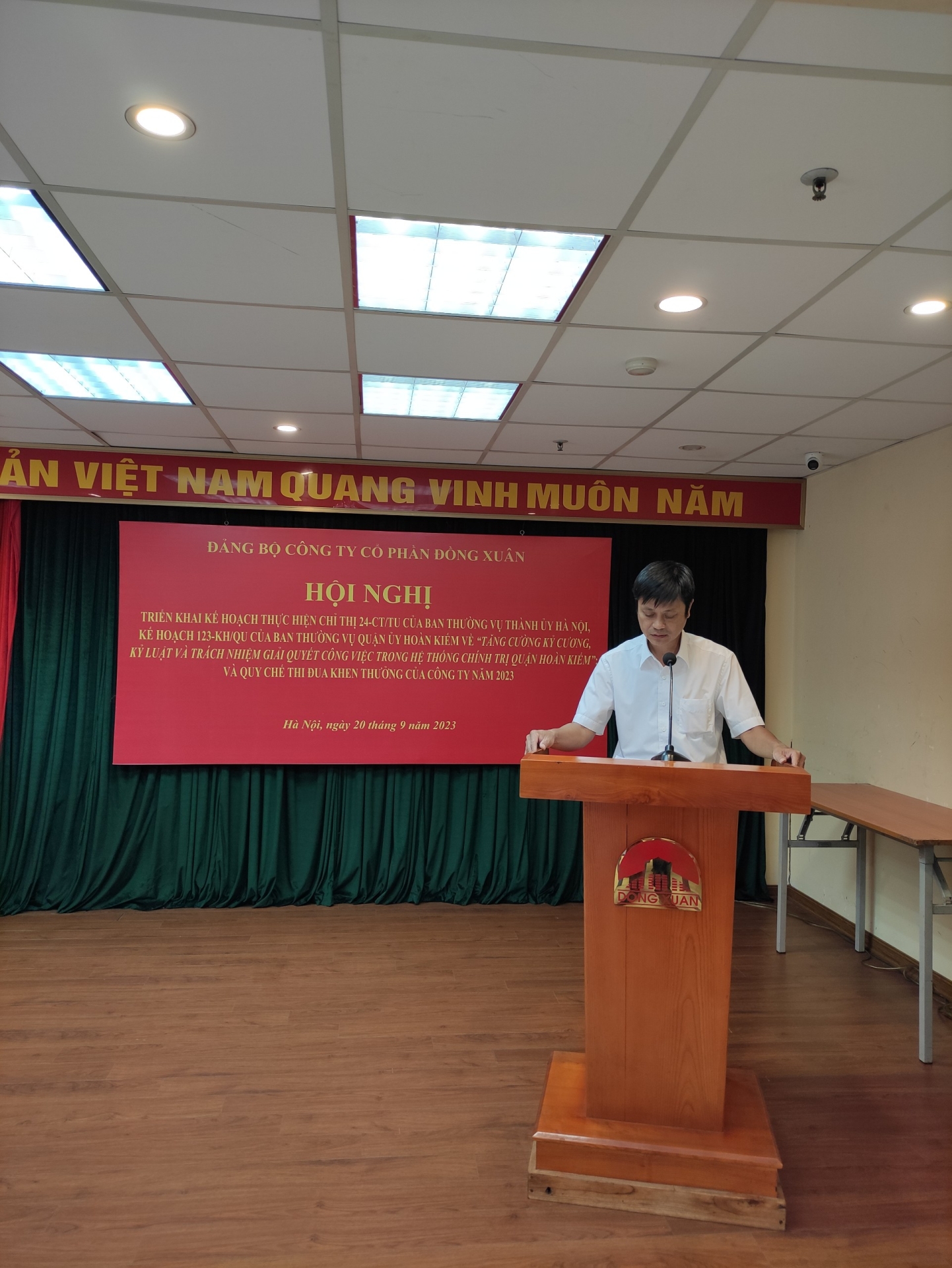 Hội nghị đã được nghe Đ/c Vũ Thành Kiên - Phó Tổng Giám đốc triển khai Kế hoạch tăng cường kỷ cương, kỷ luật và trách nhiệm giải quyết công việc trong Đảng bộ Công ty Cổ phần Đồng Xuân. Kế hoạch gồm các nhiệm vụ chính: (1) Tuyên truyền, quán triệt và triển khai thực hiện kế hoạch; (2) Đổi mới mạnh mẽ phương thức lãnh đạo, chỉ đạo, quản lý điều hành của các cấp uỷ đảng, Hội đồng quản trị, Ban Điều hành Công ty và các đoàn thể trực thuộc; (3) Rà soát, bổ sung, sửa đổi quy chế làm việc; các quy trình điều hành chung, quy trình giải quyết công việc nội bộ; (4) Siết chặt kỷ cương, kỷ luật, đạo đức công vụ của cán bộ, nhân viên công ty; kịp thời xử lý các trường hợp vi phạm; (5) Nâng cao chất lượng các cuộc họp và ban hành văn bản của Công ty, chỉ đạo theo hướng rõ trách nhiệm, rõ thẩm quyền, rõ nguyên tắc; (6) Công tác kiểm tra, giám sát, kiểm soát chặt chẽ việc thực hiện nhiệm vụ Thành phố, Quận ủy- UBND quận và Đảng ủy Công ty giao.