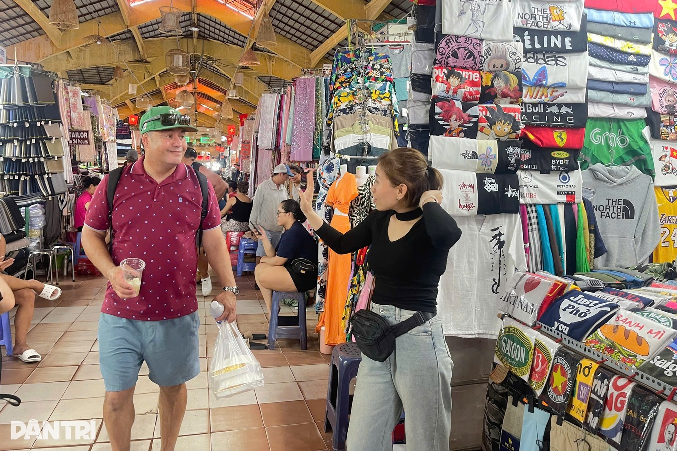 Ngồi trước sạp hàng nhỏ tại Chợ Bến Thành, chị Trần Thị Minh Kỷ (38 tuổi, quê Vĩnh Long) niềm nở chào du khách bằng tiếng Anh.