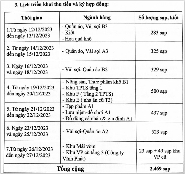 * Lịch ký hợp đồng và thu tiền giá dịch vụ sử dụng diện tích bán hàng tại chợ Đồng Xuân năm 2024: