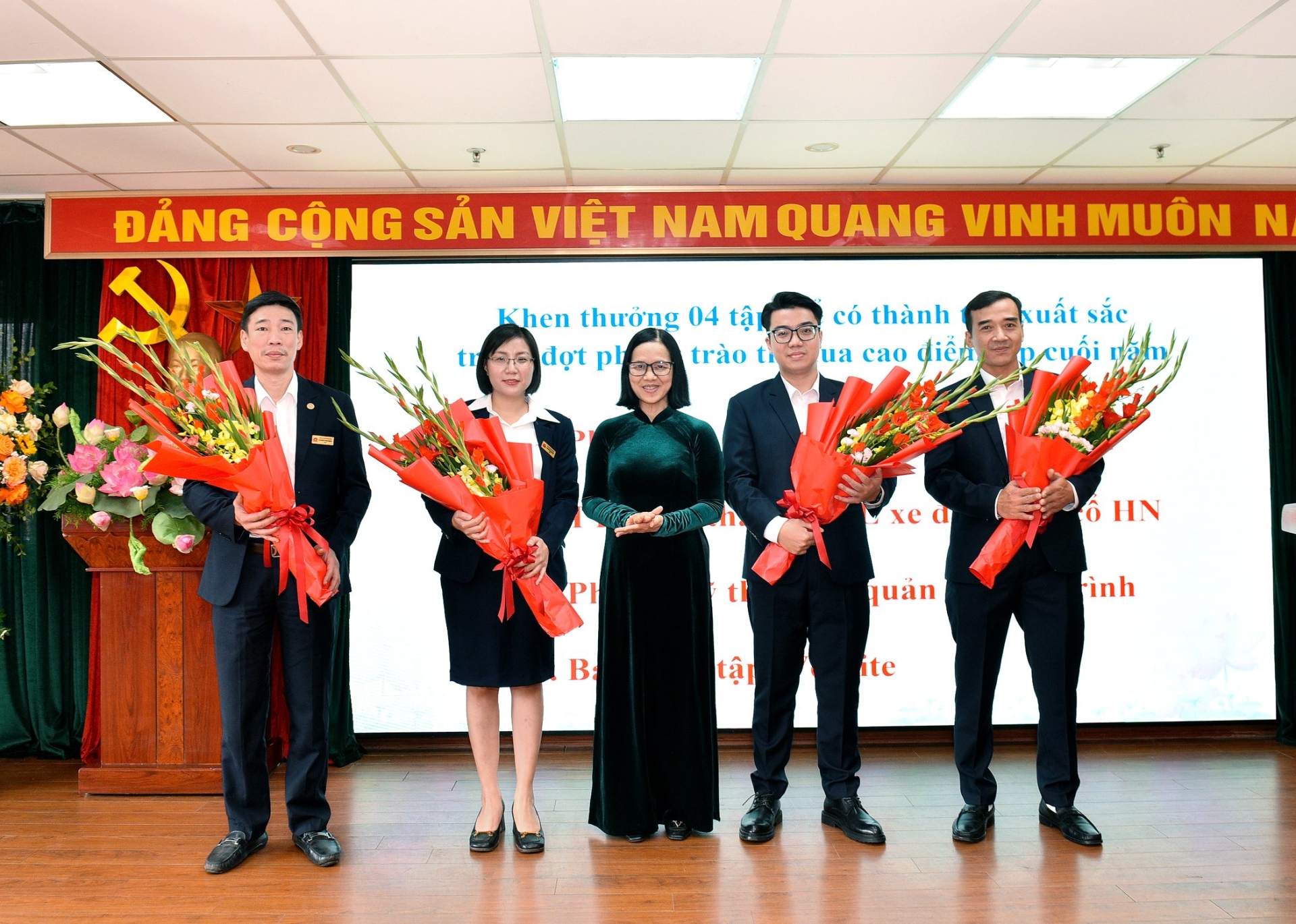 Đ/c Hà Thị Minh - Phó Tổng Giám đốc trao khen thưởng cho các tập thể có thành tích xuất sắc trong đợt thi đua cao điểm dịp cuối năm