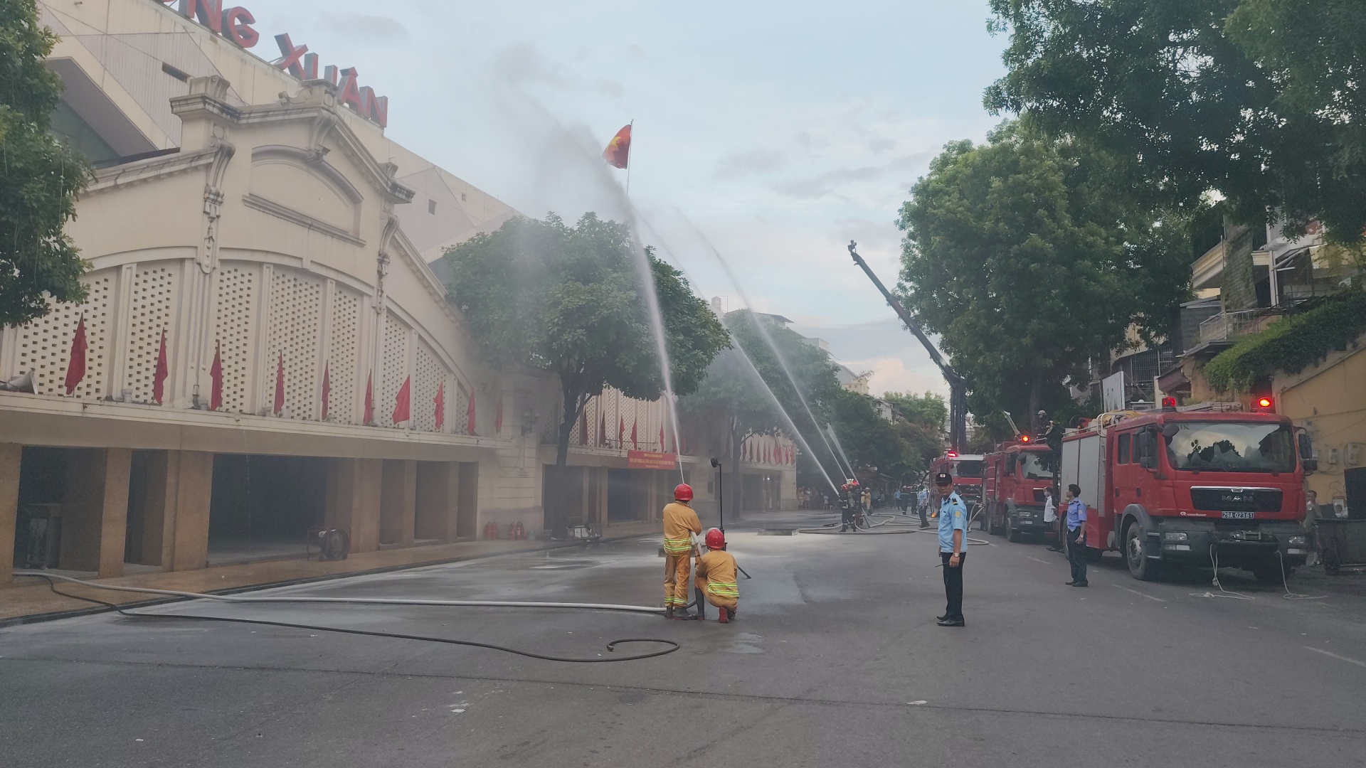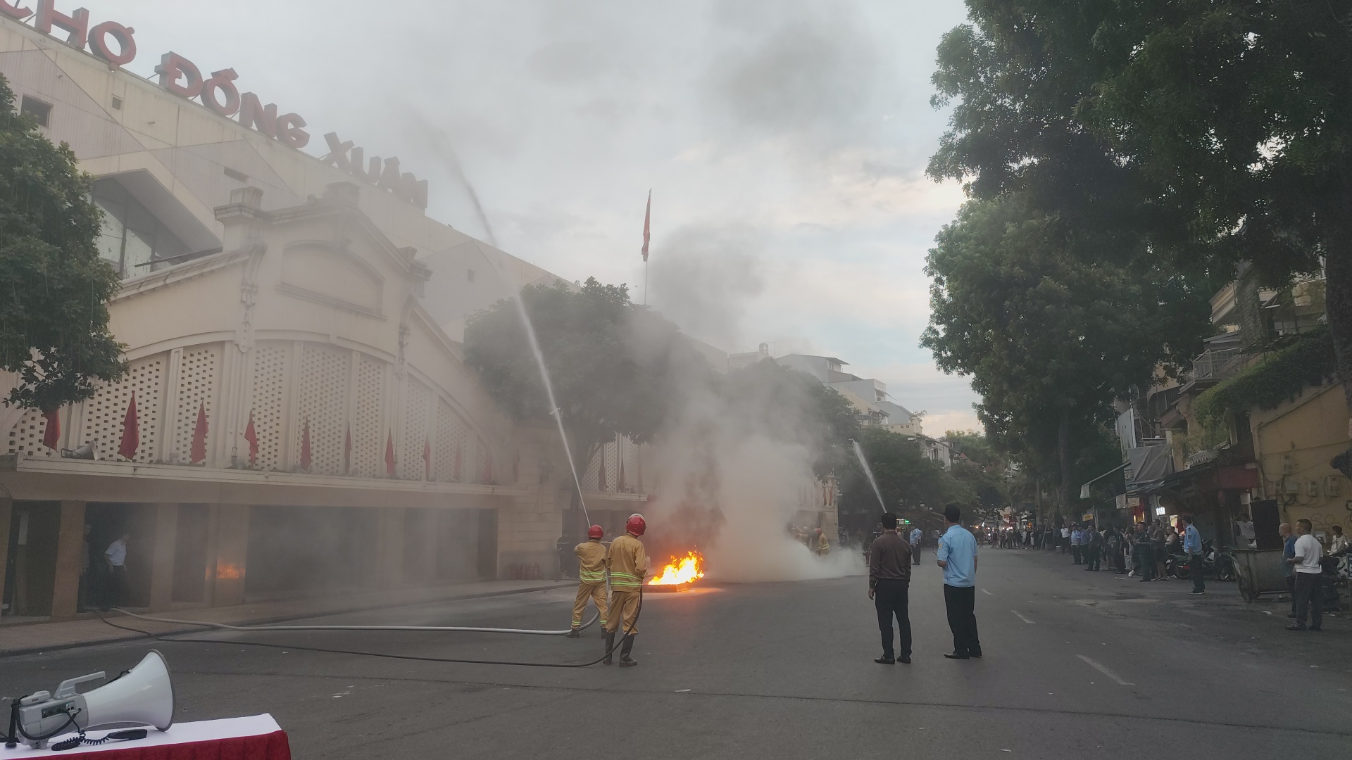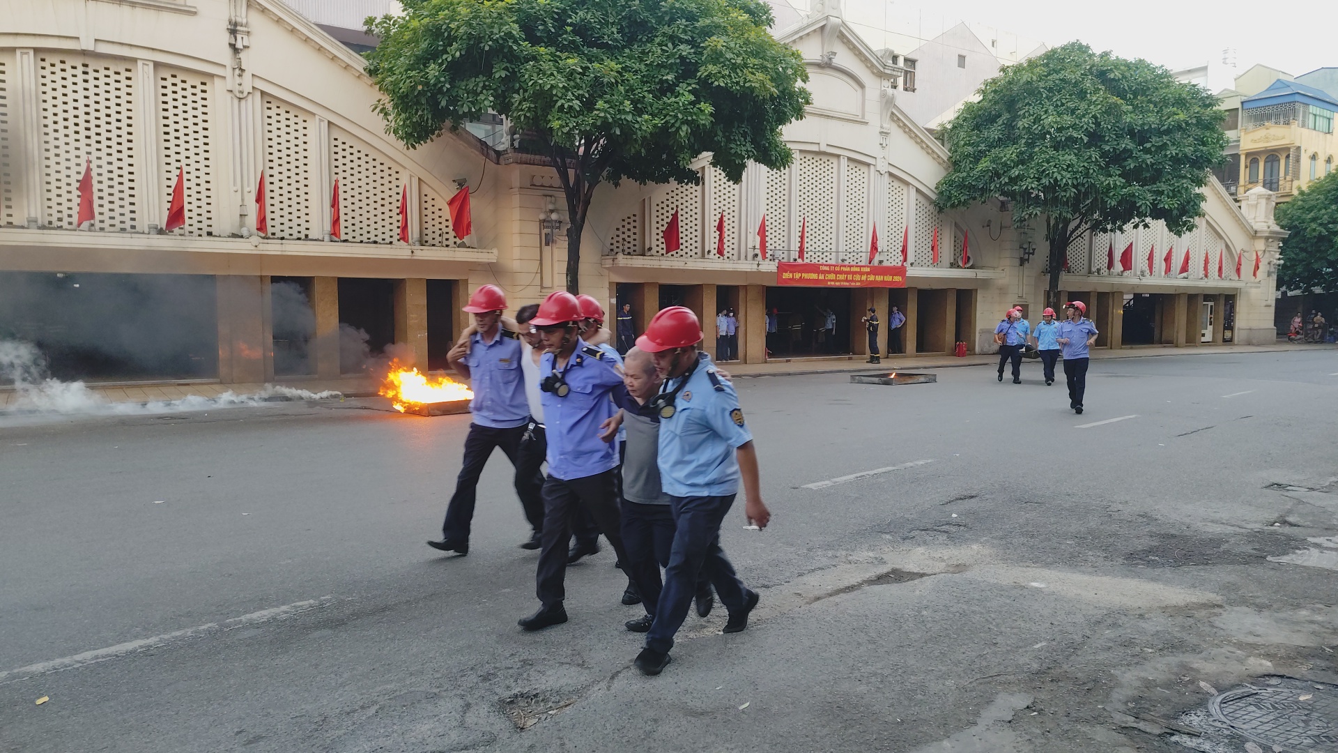 Tình huống giả định: Hồi 18 giờ 00 phút ngày 10 tháng 7 năm 2024, xảy ra cháy tại khu vực Kiot bán hàng tầng 1 chợ Đồng Xuân, do khu vực kiot bán hàng đang trong quá trình sửa chữa, một công nhân vô ý hút thuốc để tàn lửa từ thuốc lá rơi xuống khu vực để hàng hóa bắt cháy, đám cháy nhanh chóng bùng phát lan ra bìa catton, mút, xốp,…, tỏa ra nhiều khói, khí độc. Khi cháy xảy ra, qua tín hiệu loa báo cháy, mọi người hô hoán và nhanh chóng thoát nạn ra bên ngoài. Công nhân đang sửa chữa và lực lượng PCCC cơ sở đã sử dụng bình chữa cháy xách tay để chữa cháy nhưng chưa thể tiếp cận được do những người trong Chợ chen lấn thoát ra ngoài dẫn đến công tác chữa cháy ban đầu không hiệu quả.