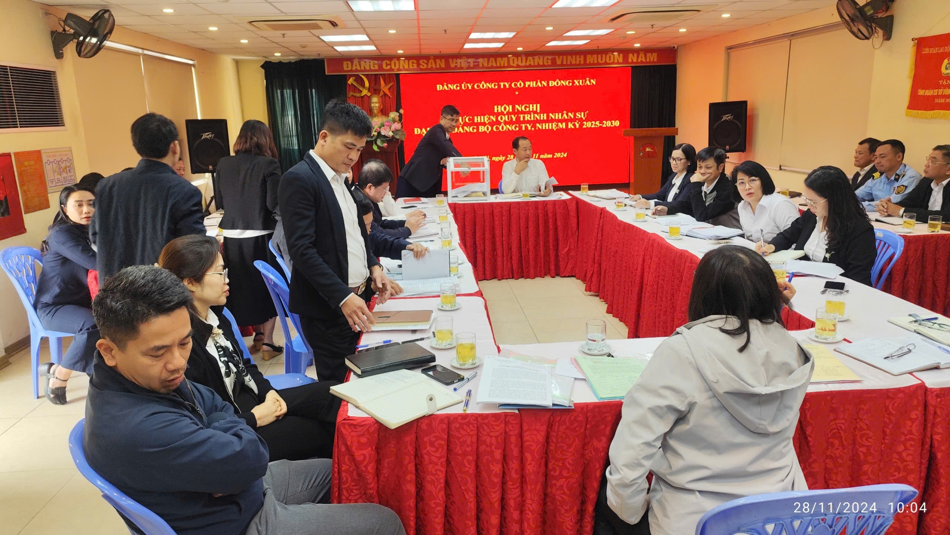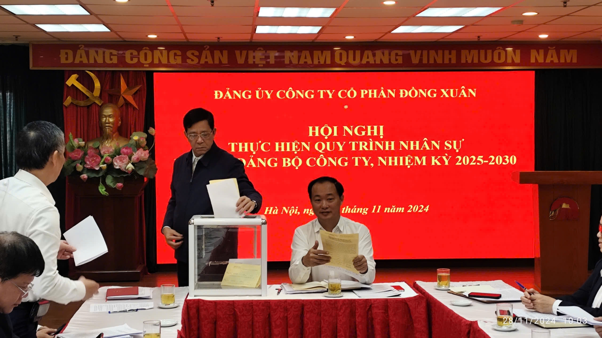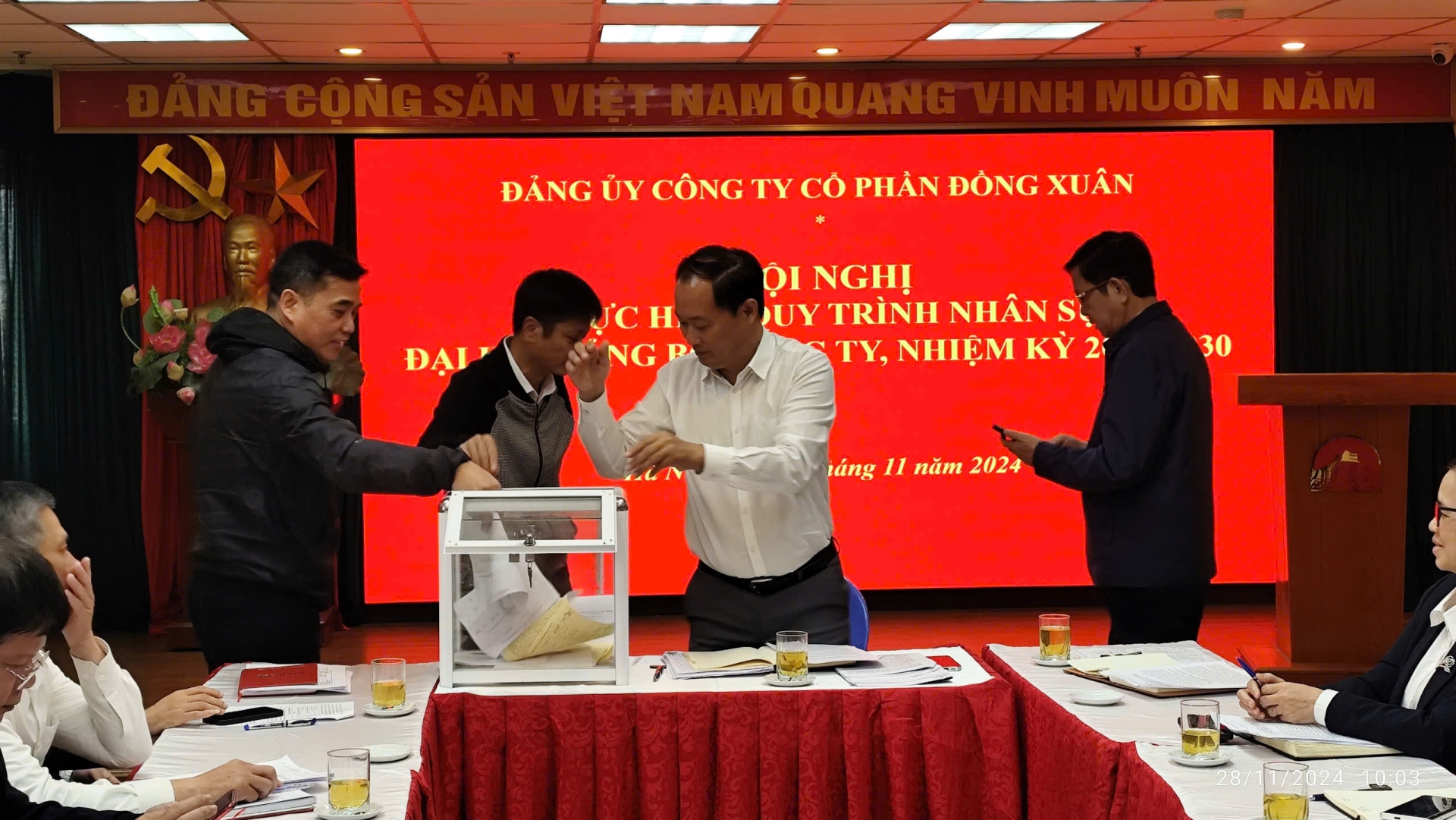 Thực hiện Chỉ thị số 35-CT/TW ngày 14/6/2024 của Bộ Chính trị (khóa XIII) về đại hội đảng bộ các cấp tiến tới Đại hội đại biểu toàn quốc lần thứ XIV của Đảng; Kế hoạch số 258-KH/TƯ ngày 15/7/2024 của Thành ủy Hà Nội về tổ chức đại hội đảng bộ các cấp tiến tới Đại hội đại biểu Đảng bộ thành phố Hà Nội lần thứ XVIII; Kế hoạch số 175-KH/QU ngày 15/8/2024 của Quận ủy về tổ chức Đại hội đảng cấp cơ sở tiến tới Đại hội Đảng bộ quận Hoàn Kiếm lần thứ XXVII, nhiệm kỳ 2025-2030; Hướng dẫn số 09-HD/QU ngày 25/10/2024 của Quận ủy Hoàn Kiếm về Công tác nhân sự cấp ủy tại Đại hội đảng bộ, chi bộ cơ sở khối hành chính sự nghiệp, hiệp hội và doanh nghiệp trực thuộc Quận ủy nhiệm kỳ 2025 – 2030, Đảng ủy Công ty Cổ phần Đồng Xuân đã tiến hành quy trình nhân sự Đại hội Đảng bộ Công ty nhiệm kỳ 2025-2030.