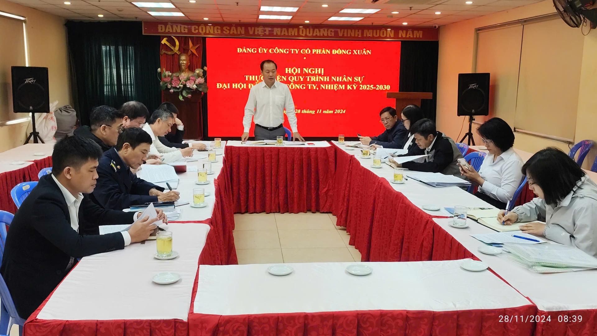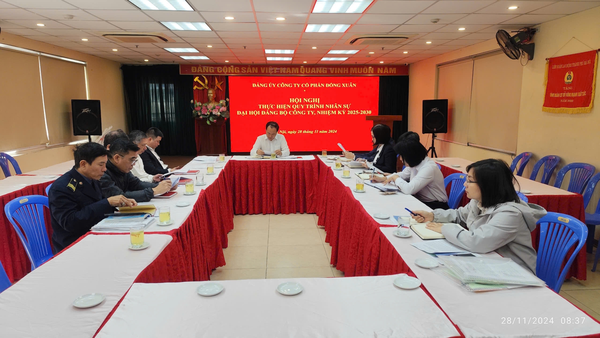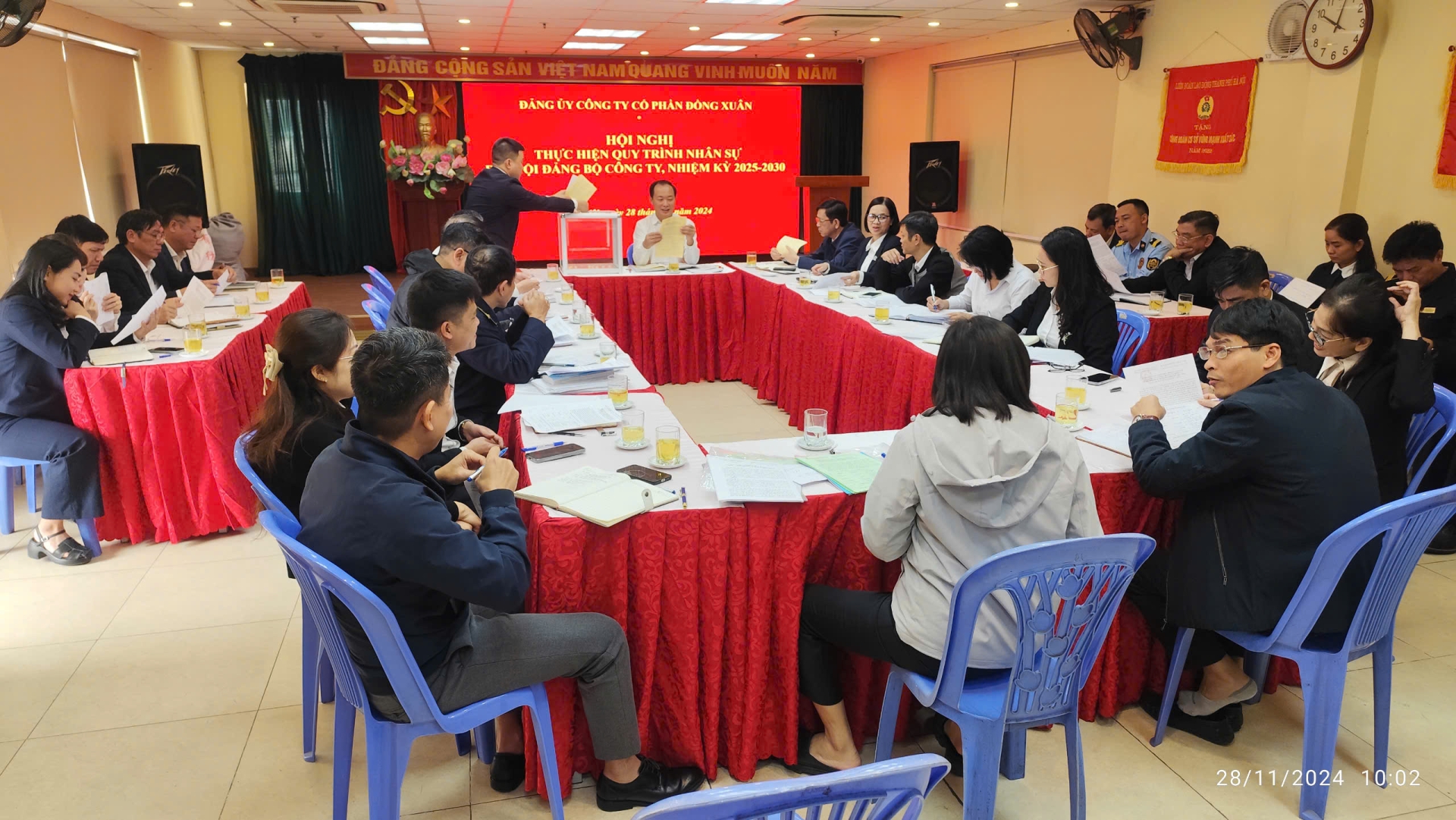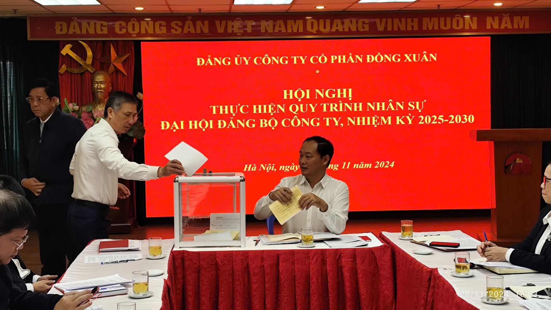 Thực hiện Chỉ thị số 35-CT/TW ngày 14/6/2024 của Bộ Chính trị (khóa XIII) về đại hội đảng bộ các cấp tiến tới Đại hội đại biểu toàn quốc lần thứ XIV của Đảng; Kế hoạch số 258-KH/TƯ ngày 15/7/2024 của Thành ủy Hà Nội về tổ chức đại hội đảng bộ các cấp tiến tới Đại hội đại biểu Đảng bộ thành phố Hà Nội lần thứ XVIII; Kế hoạch số 175-KH/QU ngày 15/8/2024 của Quận ủy về tổ chức Đại hội đảng cấp cơ sở tiến tới Đại hội Đảng bộ quận Hoàn Kiếm lần thứ XXVII, nhiệm kỳ 2025-2030; Hướng dẫn số 09-HD/QU ngày 25/10/2024 của Quận ủy Hoàn Kiếm về Công tác nhân sự cấp ủy tại Đại hội đảng bộ, chi bộ cơ sở khối hành chính sự nghiệp, hiệp hội và doanh nghiệp trực thuộc Quận ủy nhiệm kỳ 2025 – 2030, Đảng ủy Công ty Cổ phần Đồng Xuân đã tiến hành quy trình nhân sự Đại hội Đảng bộ Công ty nhiệm kỳ 2025-2030.