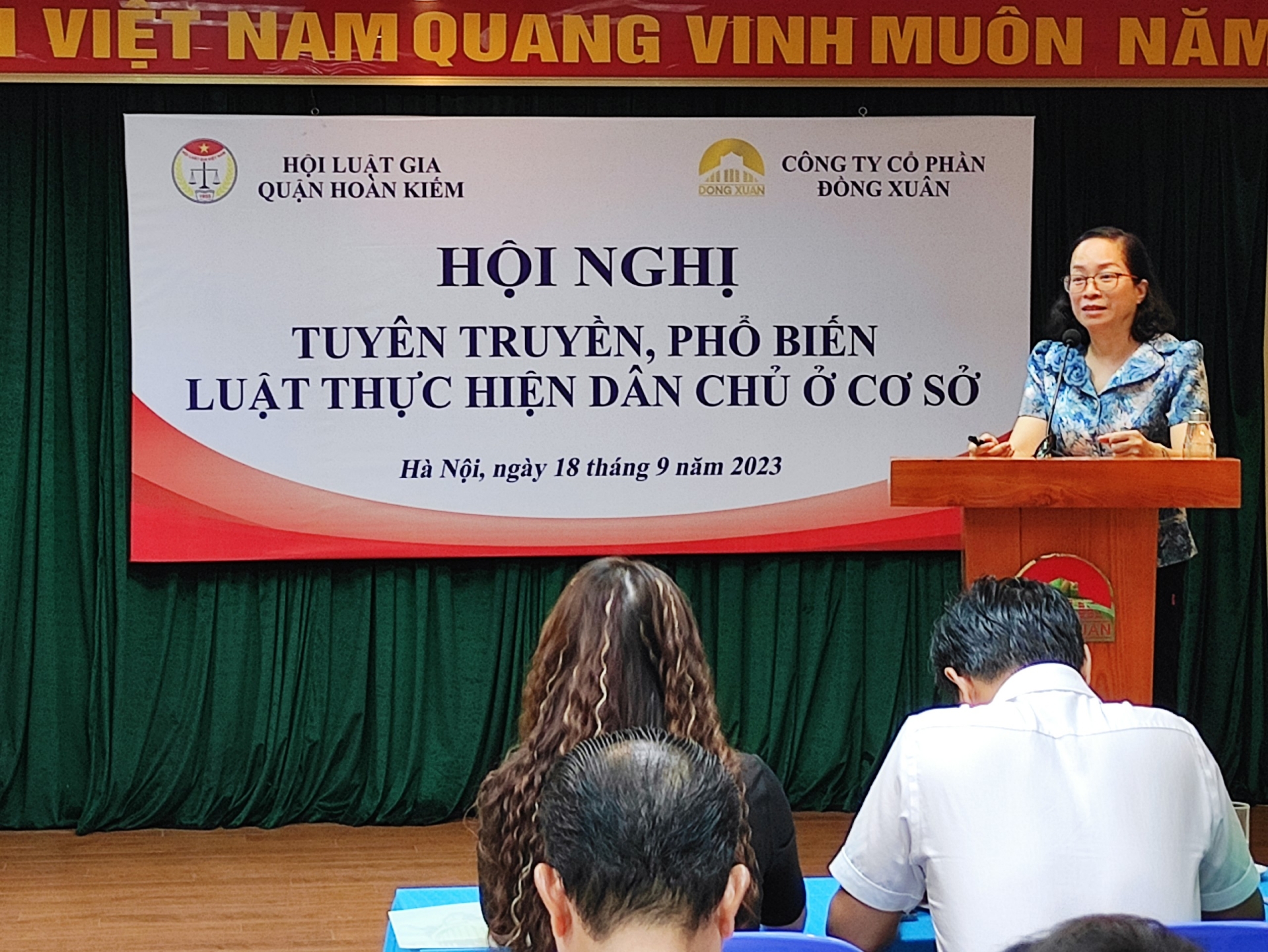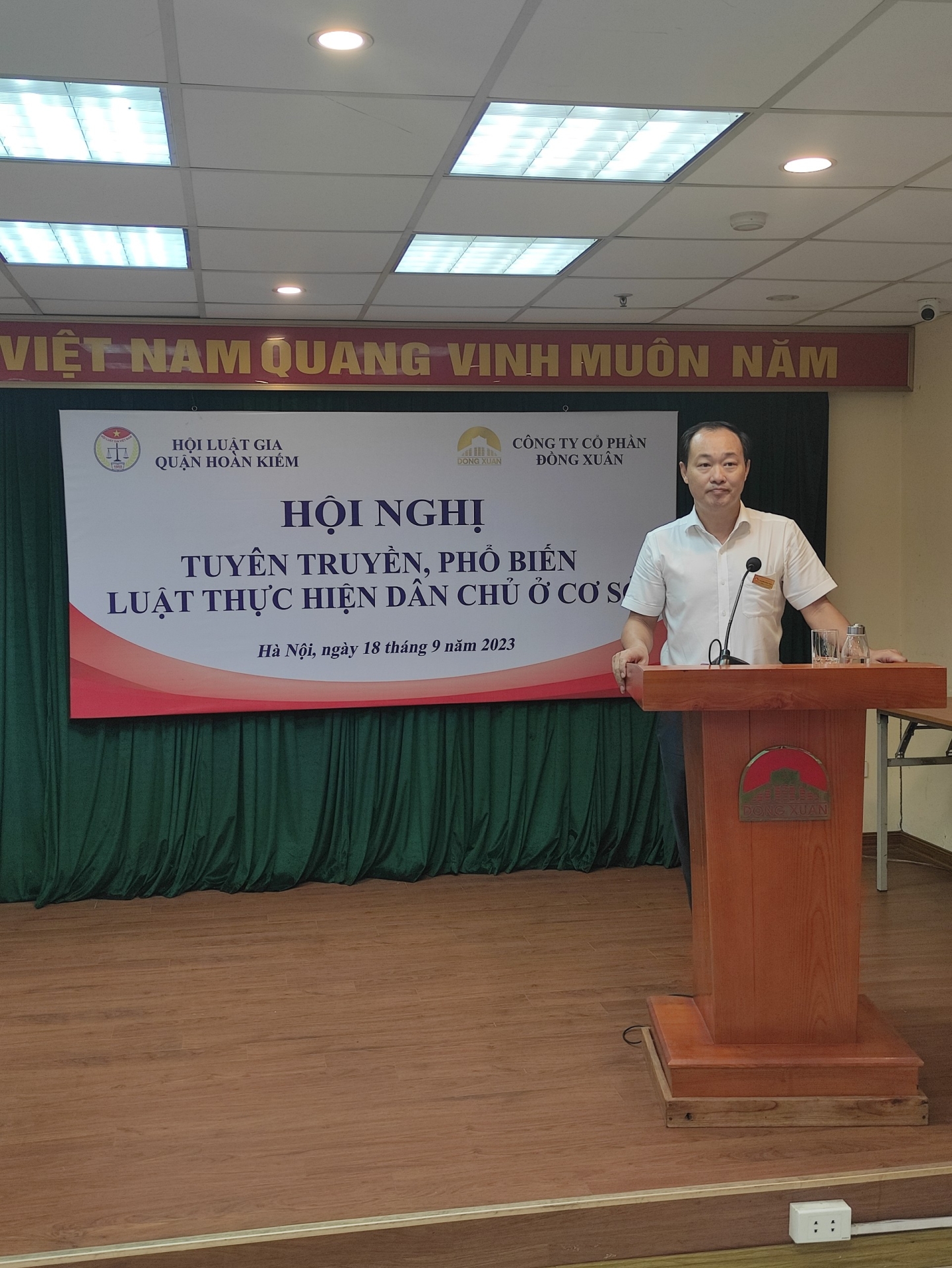 Thực hiện Kế hoạch số 125-KH/QU ngày 05/9/2023 của Quận ủy Hoàn Kiếm về triển khai thực hiện Luật thực hiện Dân chủ ở cơ sở, được sự đồng ý của Đảng ủy Công ty, chiều ngày 18/9/2023, Công ty Cổ phần Đồng Xuân phối hợp với Hội Luật gia quận Hoàn Kiếm tổ chức Hội nghị triển khai Luật thực hiện Dân chủ ở cơ sở tới cán bộ, nhân viên và các hộ kinh doanh tại chợ.