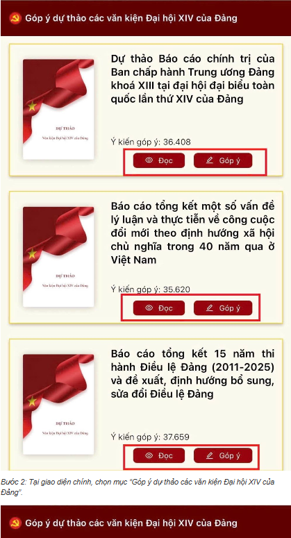 Bước 2: Tại giao diện chính, chọn mục “Góp ý dự thảo các văn kiện Đại hội XIV của Đảng”.