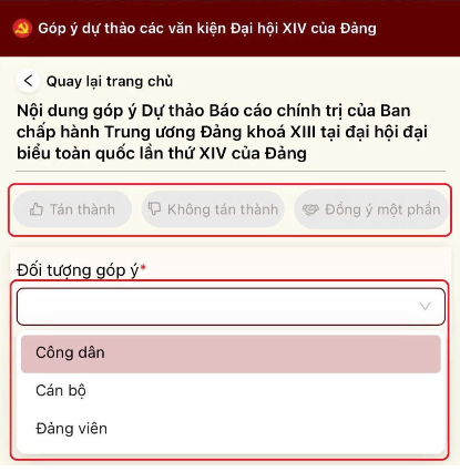 Bước 3: Chọn đọc nội dung các dự thảo văn kiện, sau đó lựa chọn đối tượng góp ý là “Công dân”, “cán bộ”, “đảng viên” và nhập ý kiến góp cá nhân vào ô “Góp ý”.