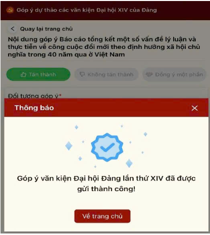 Bước 4: Kiểm tra lại thông tin, chọn “Gửi góp ý” để hoàn tất. Hệ thống sẽ xác nhận thành công và lưu lại ý kiến gửi về Ban Biên tập giúp việc Tiểu ban Văn kiện Đại hội XIV.