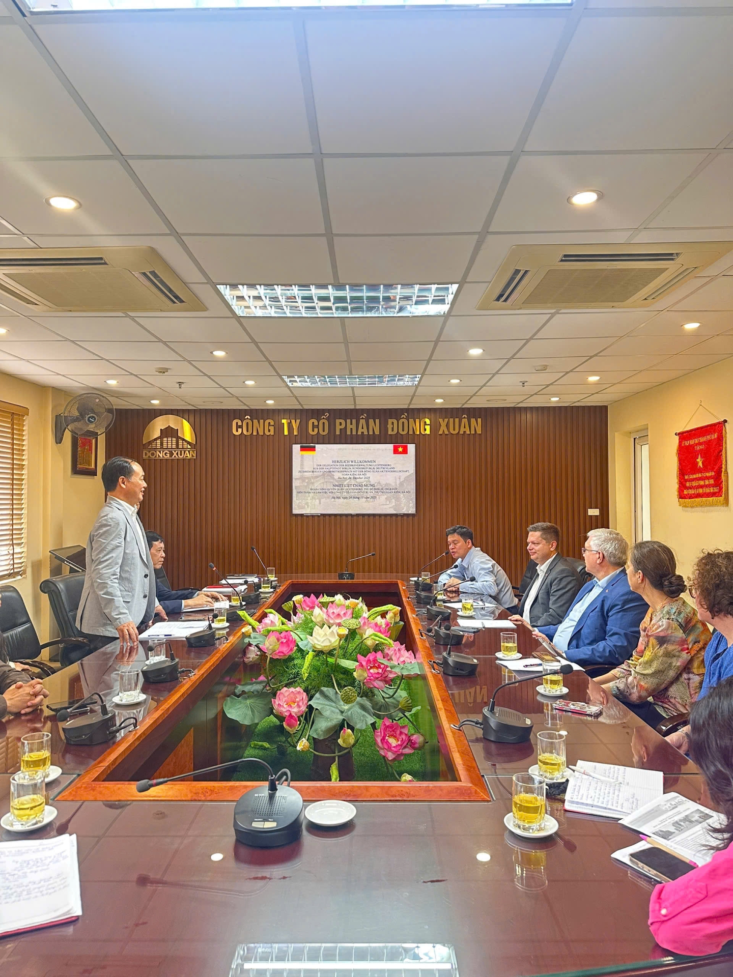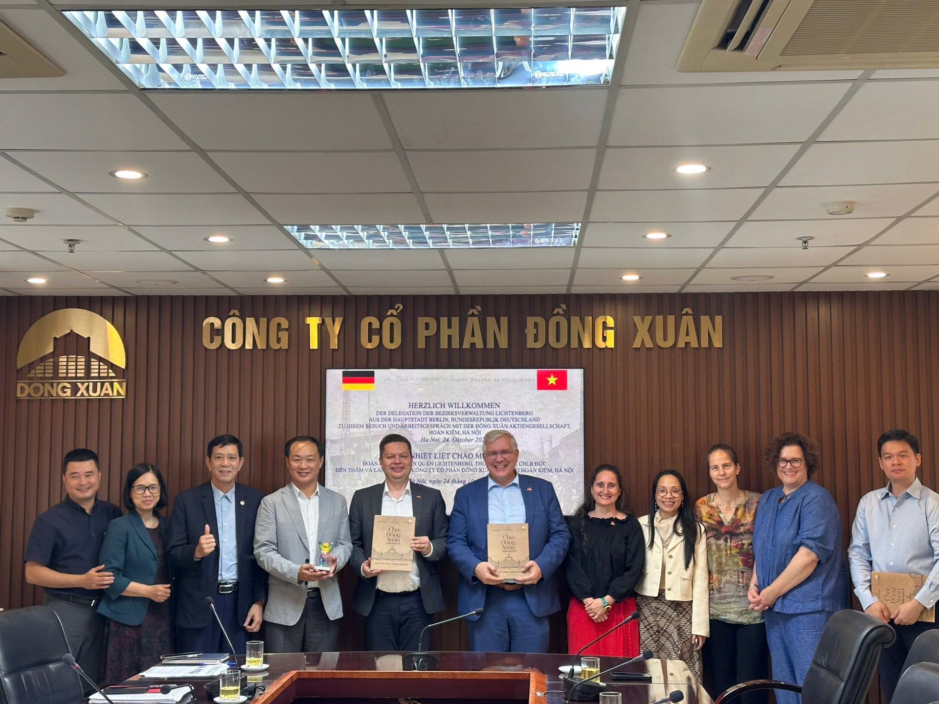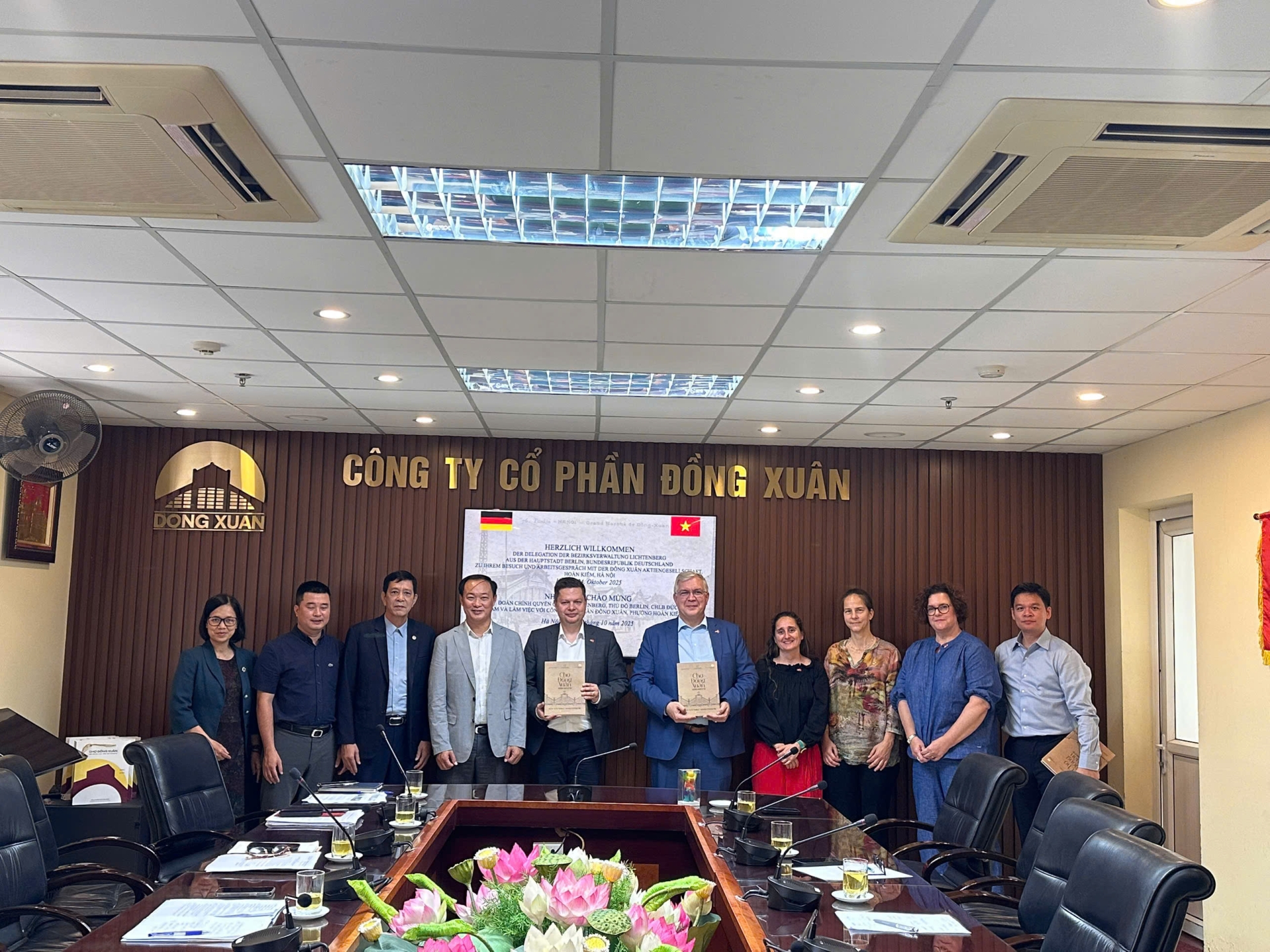 Đại diện lãnh đạo Công ty cổ phần Đồng Xuân tiếp đoàn đại biểu quận Lichtenberg có ông Nguyễn Song Tùng - Bí thư Đảng ủy, Chủ tịch HĐQT Công ty; Đ/c Hoàng Công Anh - Phó Bí thư Đảng ủy, Tổng Giám đốc; Các đồng chí Ủy viên HĐQT Công ty, các đồng chí trong ban Tổng Giám đốc cùng đại diện các phòng, ban, đơn vị