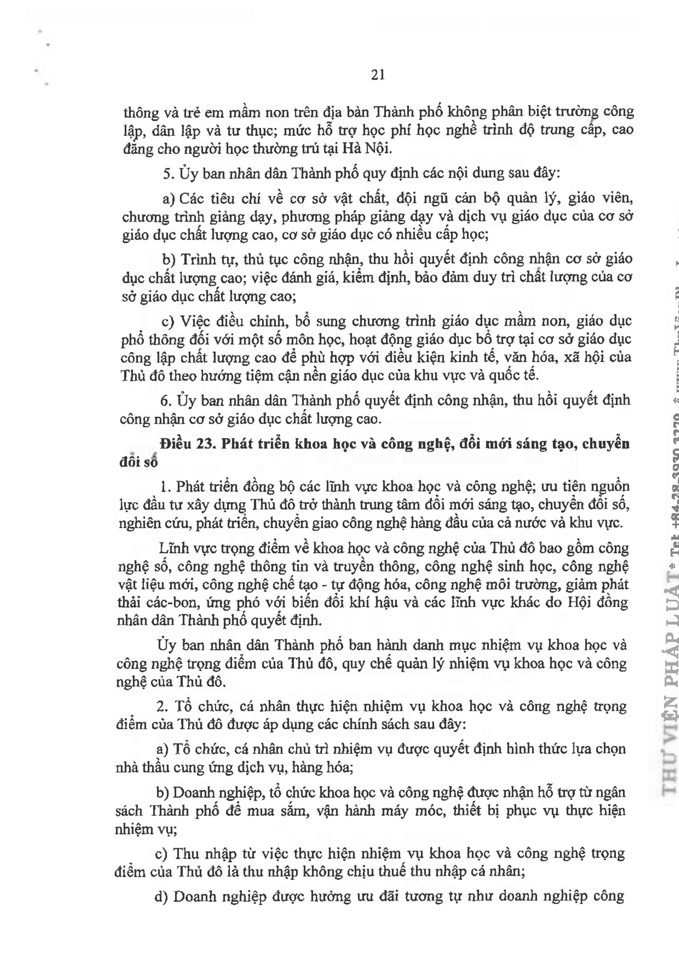 Ngoài ra, luật cũng quy định các chính sách về tuyển dụng, quản lý, sử dụng cán bộ, công chức, viên chức; thu hút, trọng dụng người có tài năng và phát triển nguồn nhân lực chất lượng cao; phát triển văn hóa, thể thao, du lịch; phát triển khoa học và công nghệ, đổi mới sáng tạo, chuyển đổi số…