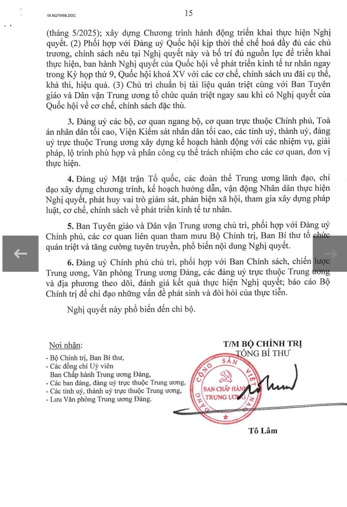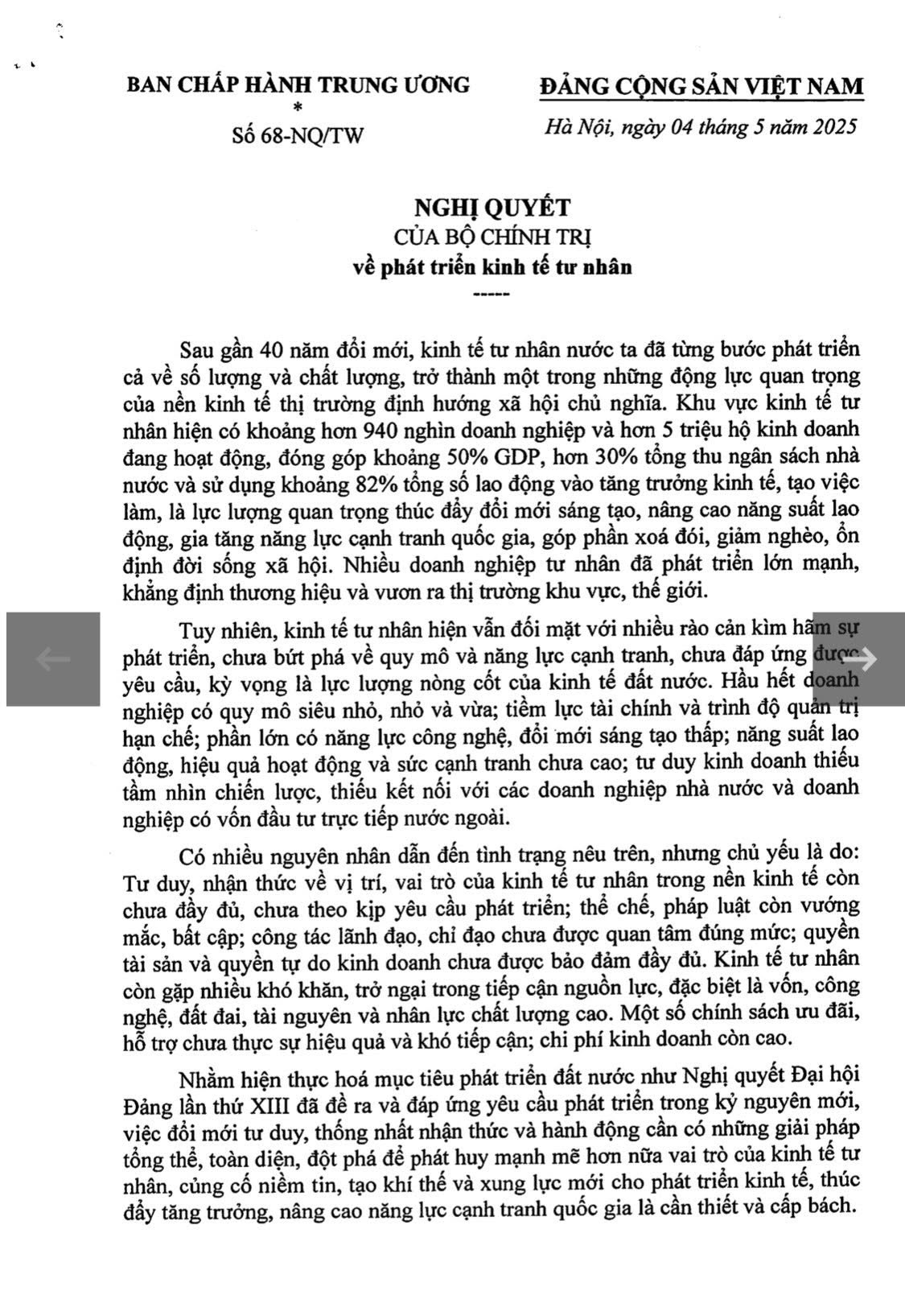 Bộ Chính trị ban hành Nghị quyết số 68-NQ/TW ngày 4/5/2025 về phát triển kinh tế tư nhân09:43 - 07/05/2025Các bài phát biểu của lãnh đạo Đảng, Nhà nước, Chính trị, Thay mặt Bộ Chính trị, Tổng Bí thư Tô Lâm vừa ký Nghị quyết số 68-NQ/TW ngày 4/5/2025 của Bộ Chính trị về phát triển kinh tế tư nhân. Xin trân trọng giới thiệu toàn văn Nghị quyết này Chia sẻ: