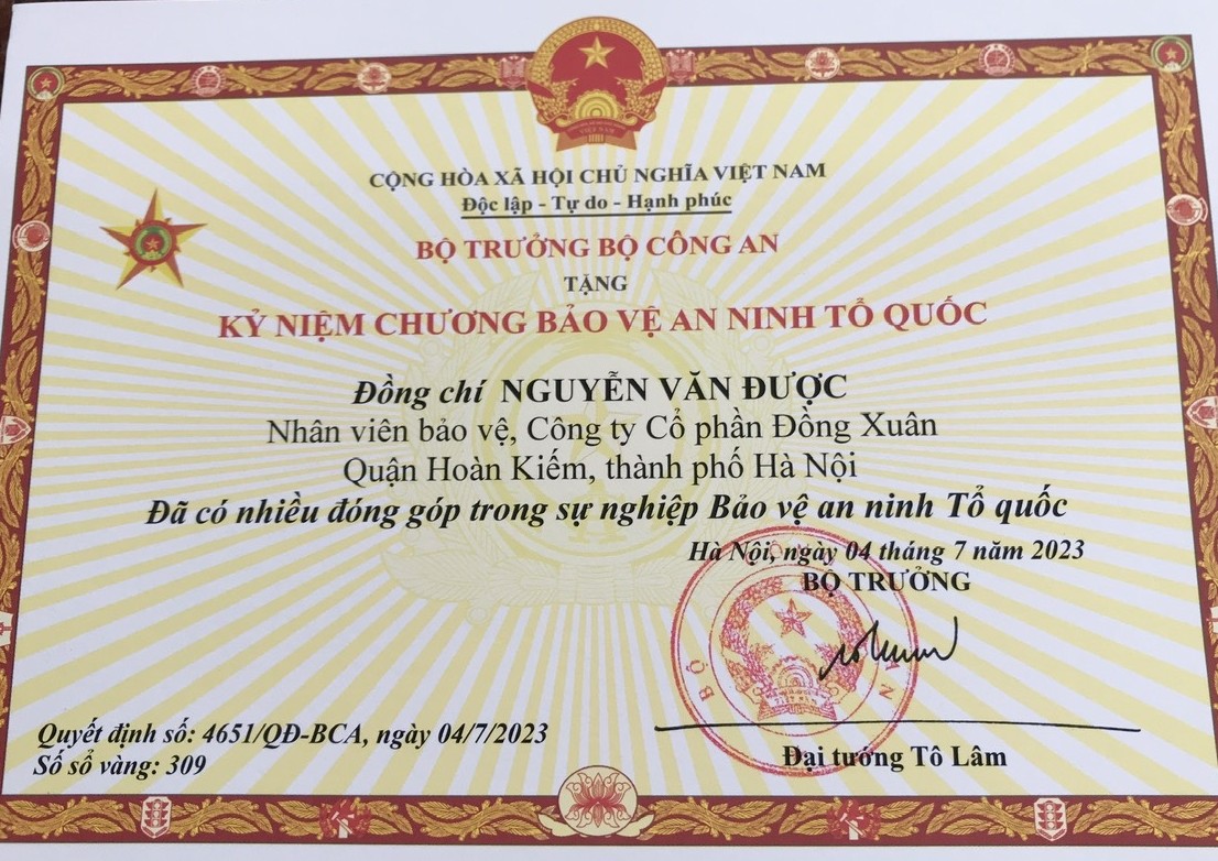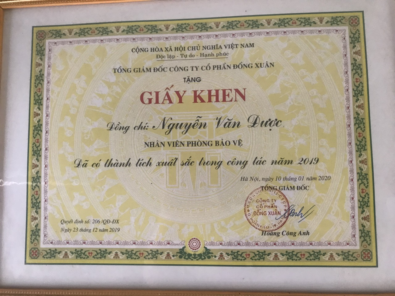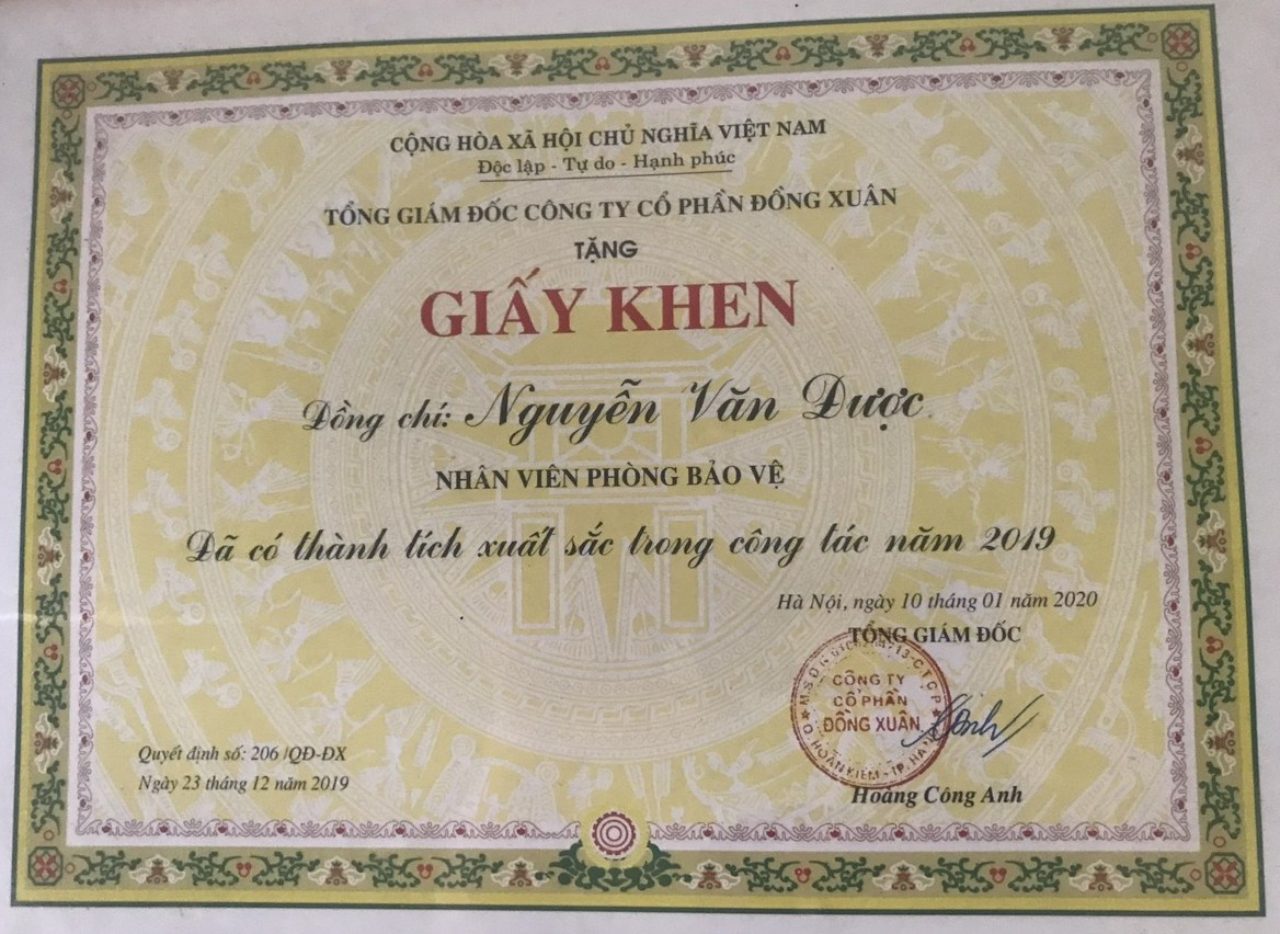Anh Được luôn hoàn thành xuất sắc mọi nhiệm vụ được Phòng bảo vệ, Công ty giao phó. Cụ thể qua những tấm Bằng khen, Giấy khen của Thành phố, của Quận Hoàn Kiếm trao tặng. Tấm gương của anh Nguyễn Văn Được xứng đáng được biểu dương và lan tỏa, như một lời nhắc nhở nhẹ nhàng mà sâu sắc: “ Mỗi người trong chúng ta, dù ở vị trí nào, dù làm công việc gì chỉ cần làm việc bằng cái tâm và trách nhiệm, thì đều có thể trở thành người tốt, làm nên những việc tốt giữa đời thường.”