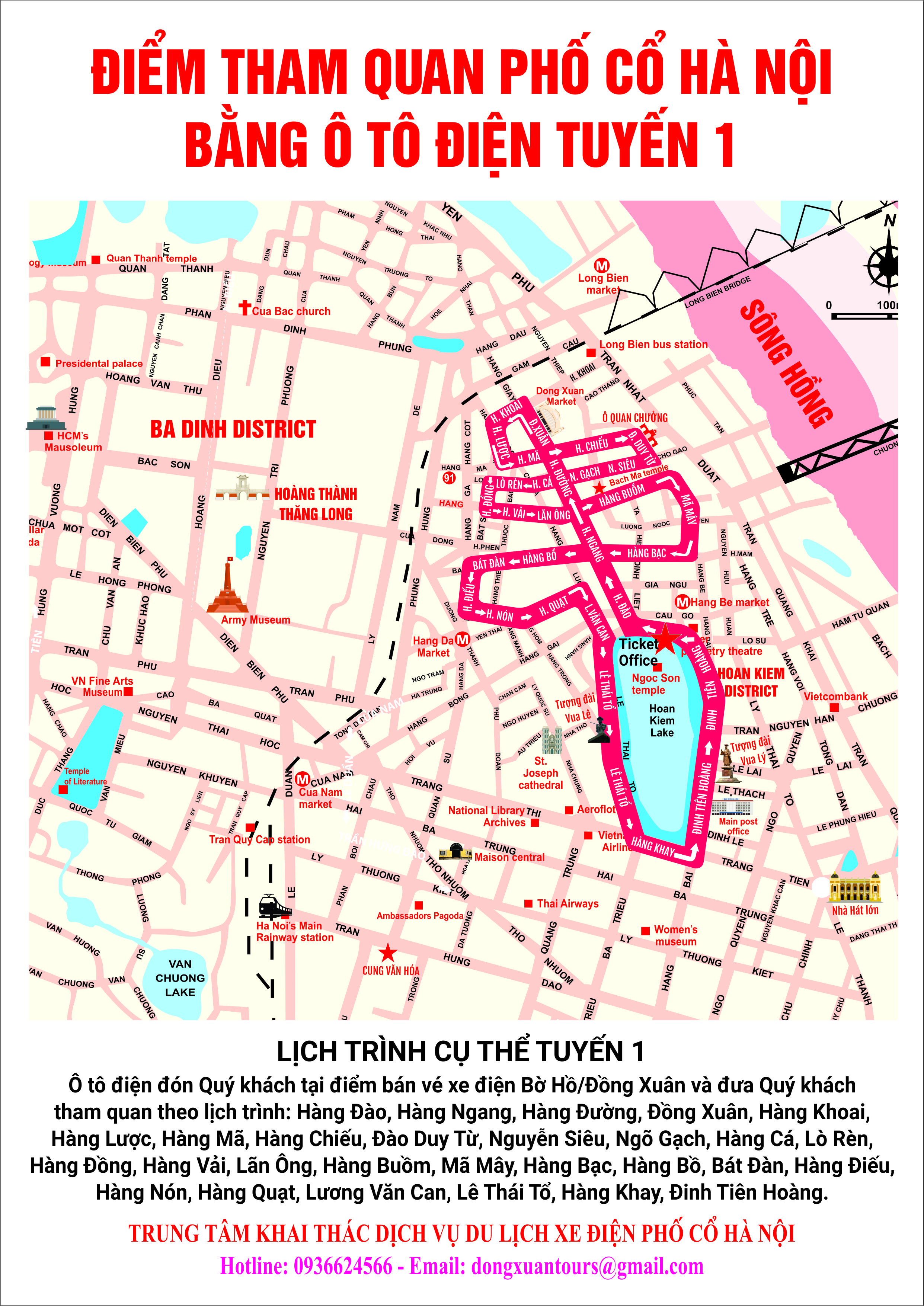 Xuất phát từ nhà ga đường đôi phố Đinh Tiên Hoàng bên hồ Hoàn Kiếm, xe điện của Công ty Cổ phần Đồng Xuân sẽ đưa du khách đi tham quan phố cổ, hồ Hoàn Kiếm và các vùng phụ cận. Ngồi trên xe điện, du khách vừa lắng nghe giới thiệu về lịch sử, văn hóa của từng khu phố cổ, các di tích danh thắng bằng hai thứ tiếng Việt - Anh, vừa được ngắm nhìn, thu vào ống kính những hình ảnh sống động về cuộc sống người dân phố cổ, về những giá trị lịch sử, văn hóa, kiến trúc phố cổ tồn tại và phát triển gắn với chiều dài lịch sử hơn 1.000 năm Thăng Long - Hà Nội.